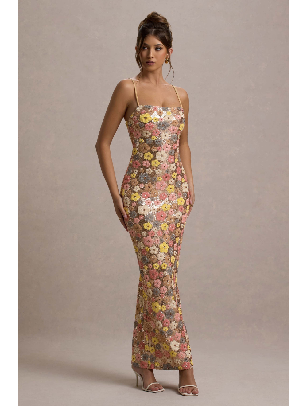 Un abito da sogno, perfetto per brillare. Selviana unisce paillettes floreali dai toni pastello, spalline...