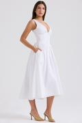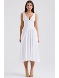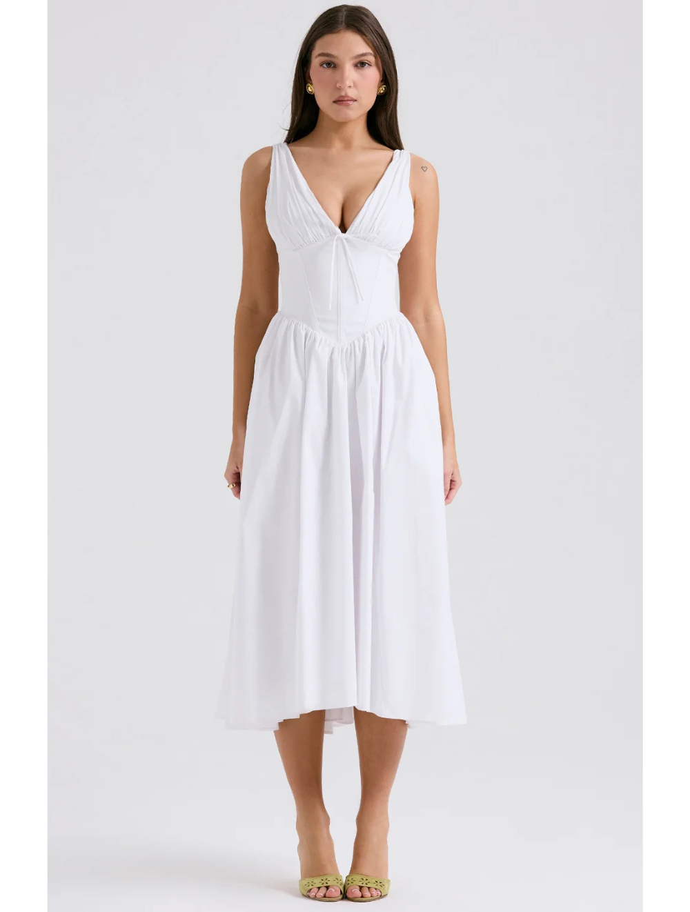 Canalizzando un'eleganza sobria, CRYSTAL è uno stile facile da indossare ovunque in un fresco tono bianco. Bellamente tagliato in tessuto ricco di cotone elasticizzato con un busto arricciato, ha una scollatura profonda che rispecchia perfettamente la schiena aperta e il corpetto è corsettato per stringere in vita.