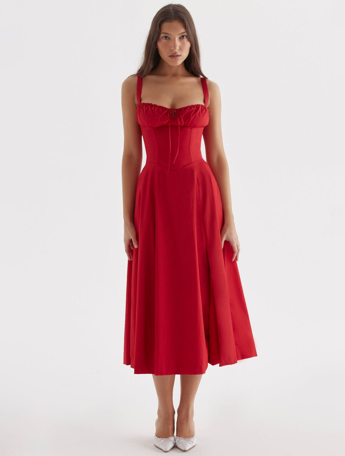 Attira l'attenzione questa stagione con il seducente Abito Sunheart Sunset Con Allaccio in un vivace rosso. Realizzato in tessuto leggero e traspirante, questo abito presenta una seducente scollatura con allaccio che valorizza perfettamente la tua silhouette, conferendole un'atmosfera audace e romantica. Le delicate maniche a sbuffo aggiungono un tocco di fantasia, mentre il corpetto aderente e la gonna fluida colpiscono il giusto equilibrio tra eleganza e fascino.