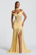 Un’eleganza che cattura lo sguardo: Elinya è l’abito maxi in giallo limone che combina sensualità e raffinatezza. Il corpino in mesh semi-trasparente con scollo bardot abbraccia le spalle, mentre la fascia elastica posteriore garantisce una vestibilità perfetta. La vita bassa e le arricciature sui fianchi si aprono su una gonna fluida con spacco vertiginoso, per un movimento leggero e sofisticato.