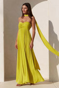 Un'eleganza senza tempo con un tocco di raffinatezza — Isavelle è un abito lungo senza spalline, caratterizzato da delicati dettagli plissettati e un design fluido che valorizza ogni figura. Completo di una sciarpa coordinata, è il capo ideale per eventi speciali o serate indimenticabili.